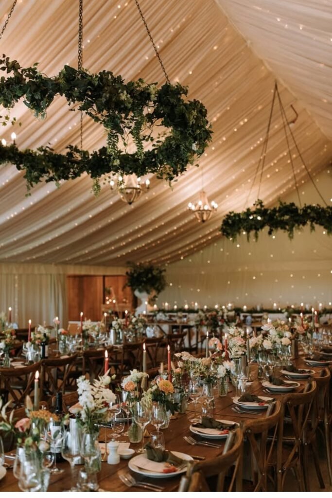 Soft fabric ceilings paired with hanging greenery instantly warm large tents, turning practical structures into romantic reception spaces for evening celebrations.