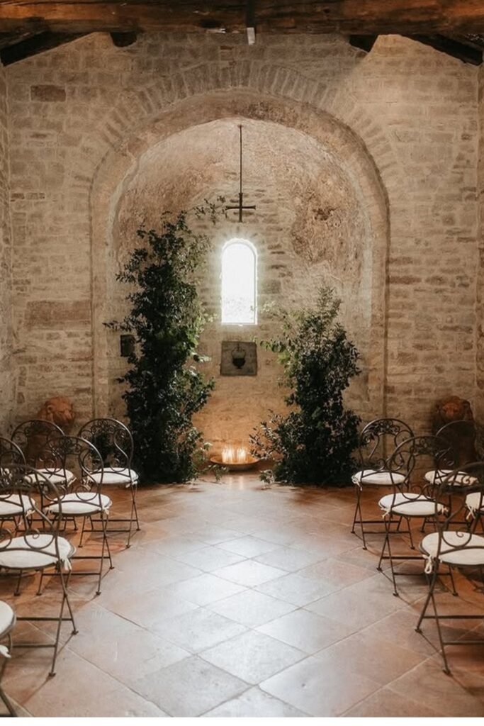 Stone-walled venues bring instant atmosphere, letting texture, arches, and candlelight replace elaborate décor entirely without heavy floral installations.