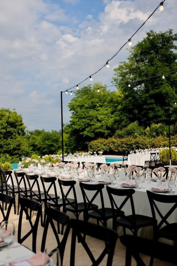 Long banquet tables work naturally here, encouraging conversation and slow dining while the venue itself provides structure and visual balance effortlessly.