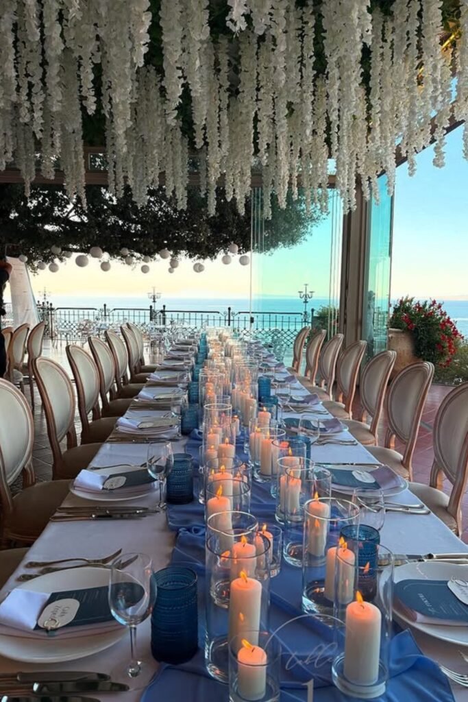 This style works well for long tables, soft linens, and minimal florals, letting texture and overhead elements carry the entire visual impact.