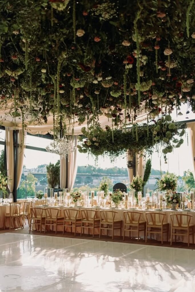 This works best in spaces with neutral floors and walls, allowing overhead florals to become the primary design statement for guests.