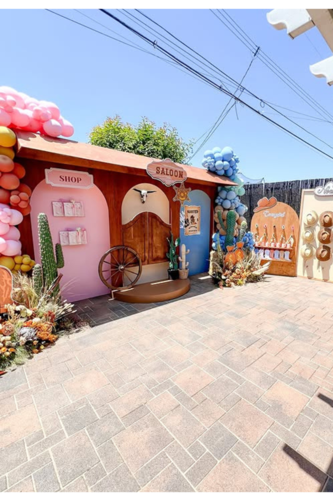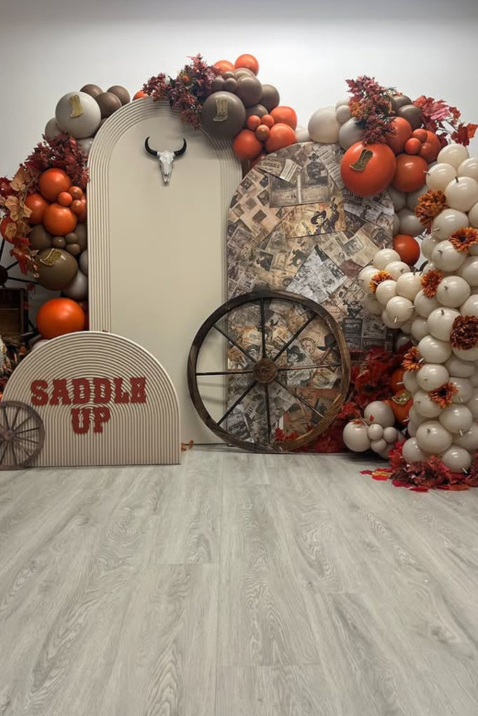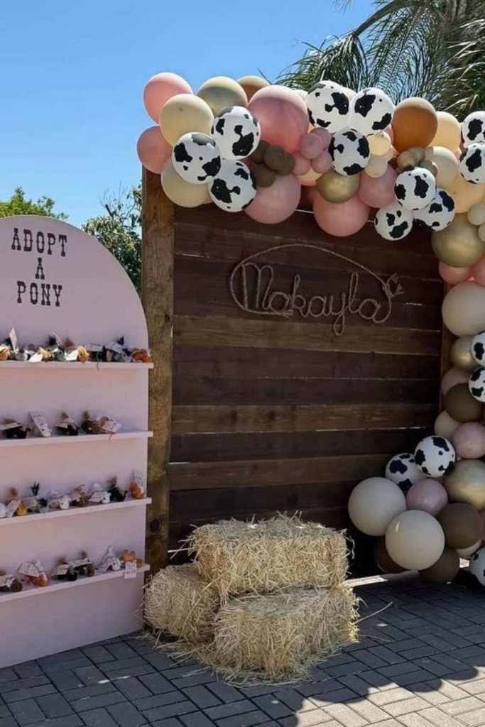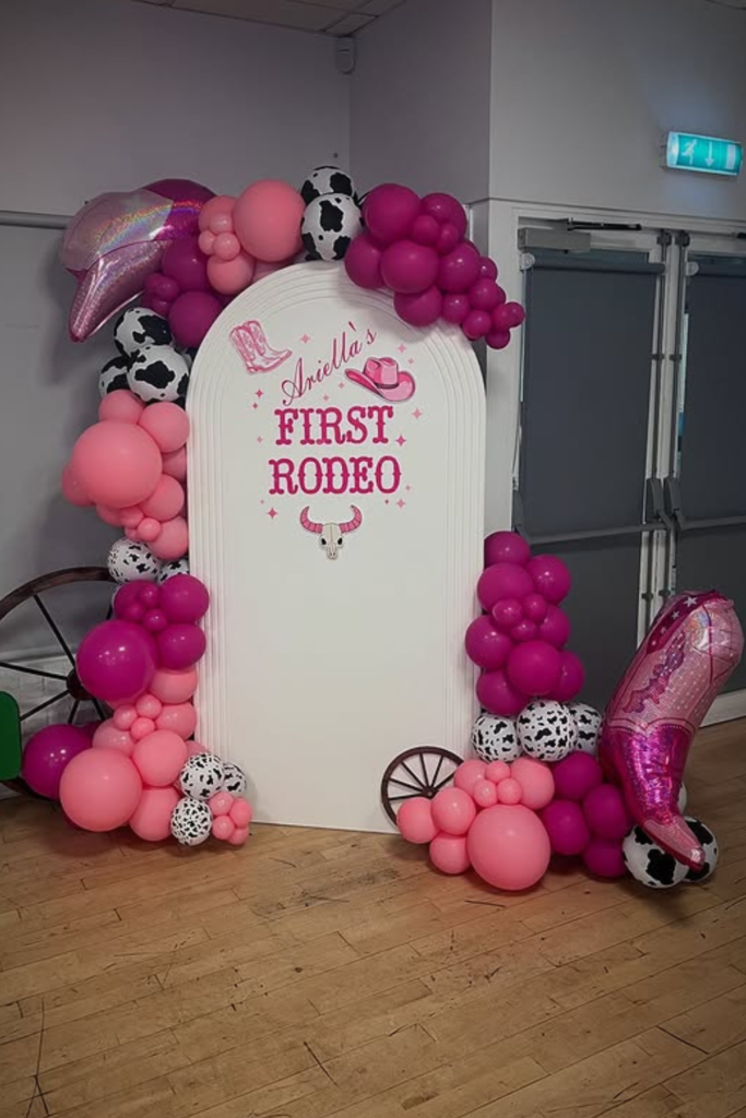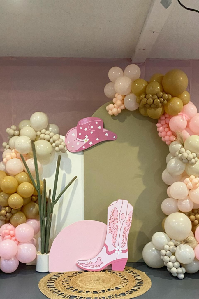 If you’re leaning into a cowgirl theme, a balloon arch with playful western props can quickly transform a blank wall into a themed photo spot.