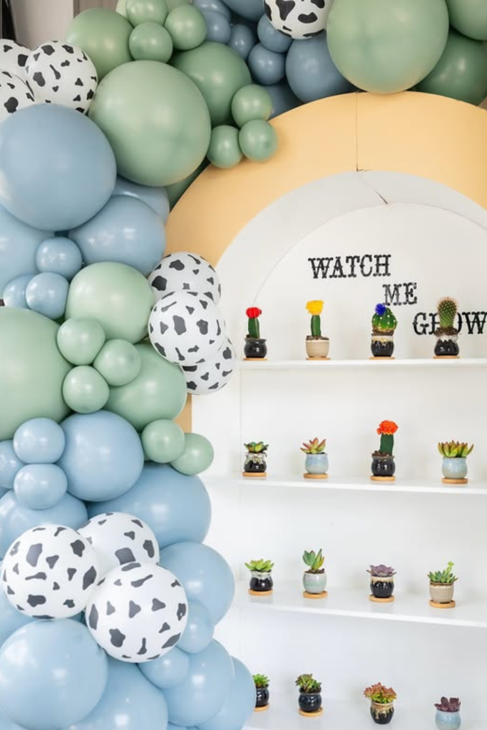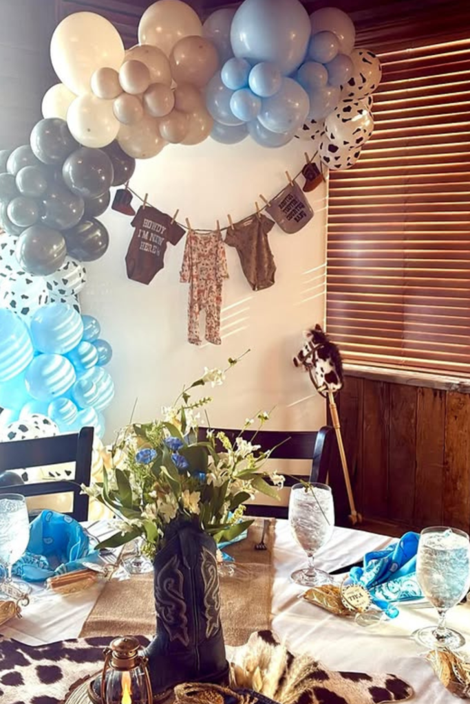 Balloon garlands in colors like dusty blue, cream, terracotta, or pink (for a cowgirl theme) help soften the look while keeping it festive.