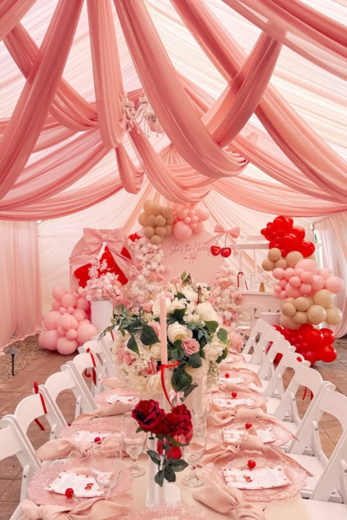 If you’re hosting outdoors, a soft draped tent setup can turn the entire space into something magical.