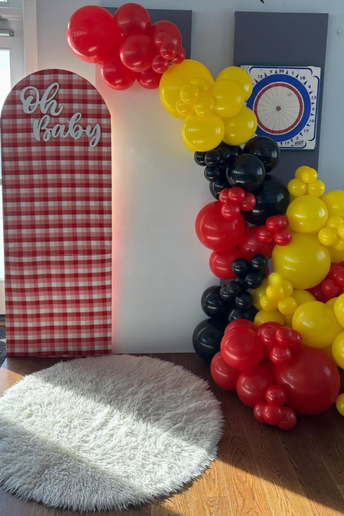 A balloon garland in bold colors like red, yellow, and black keeps the display playful while giving the photo area more dimension.
