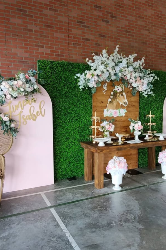 A greenery wall paired with wooden tables instantly gives the setup structure, while blush and white flowers soften the entire display.