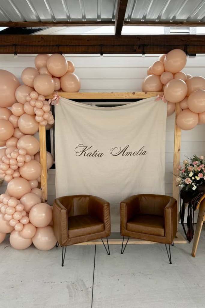 Soft beige balloon garlands, wooden frames, and leather chairs give the space a cozy ranch vibe.