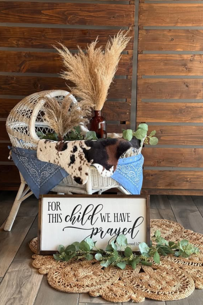 A wicker bassinet layered with cowhide fabric, bandanas, and pampas grass creates a warm ranch-inspired look.