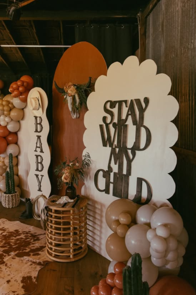Pairing them with soft balloon garlands in sage, blue, and cow-print patterns helps reinforce the western vibe without making the setup feel too heavy.