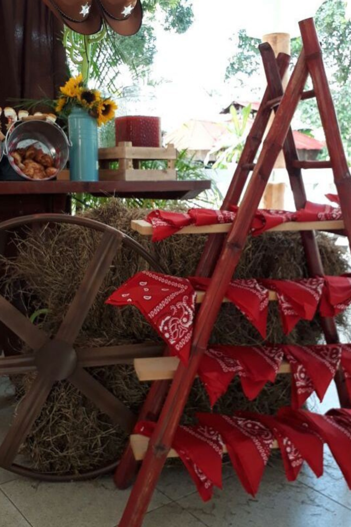 Start with rustic decorations like cowboy hats, bandanas, wagon wheels, hay bales, and wooden signs.