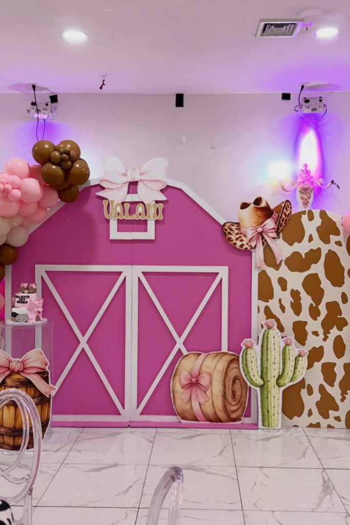 If you want your theme to lean playful and feminine, building the setup around a pink barn backdrop can instantly define the entire party.