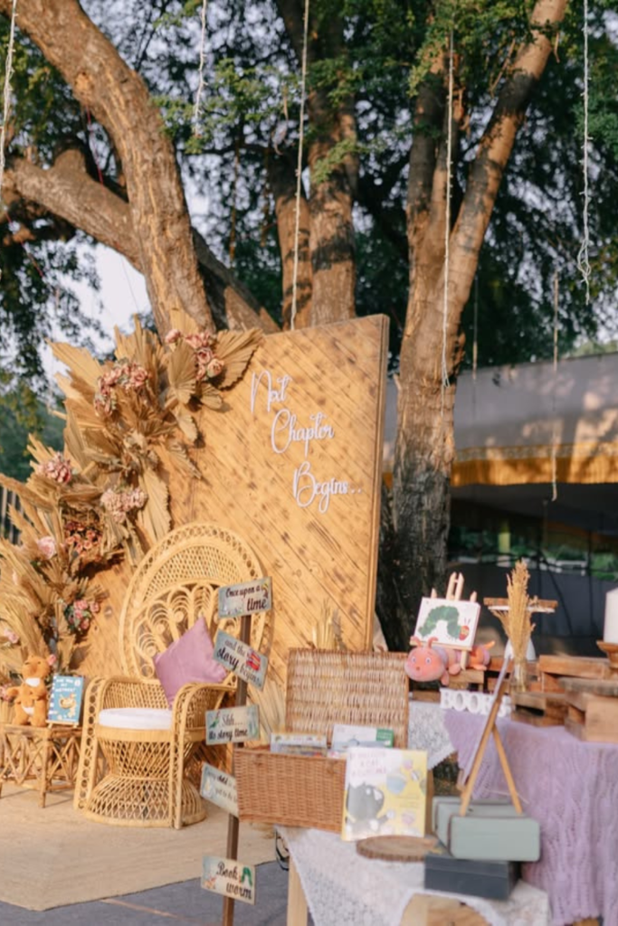 This kind of storybook-inspired setup works because it invites guests into the theme-cozy seating, books, signage, and natural textures all layered together.