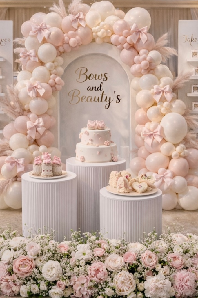 Subtle bow details on balloons, signage, and desserts tie the entire scene together.