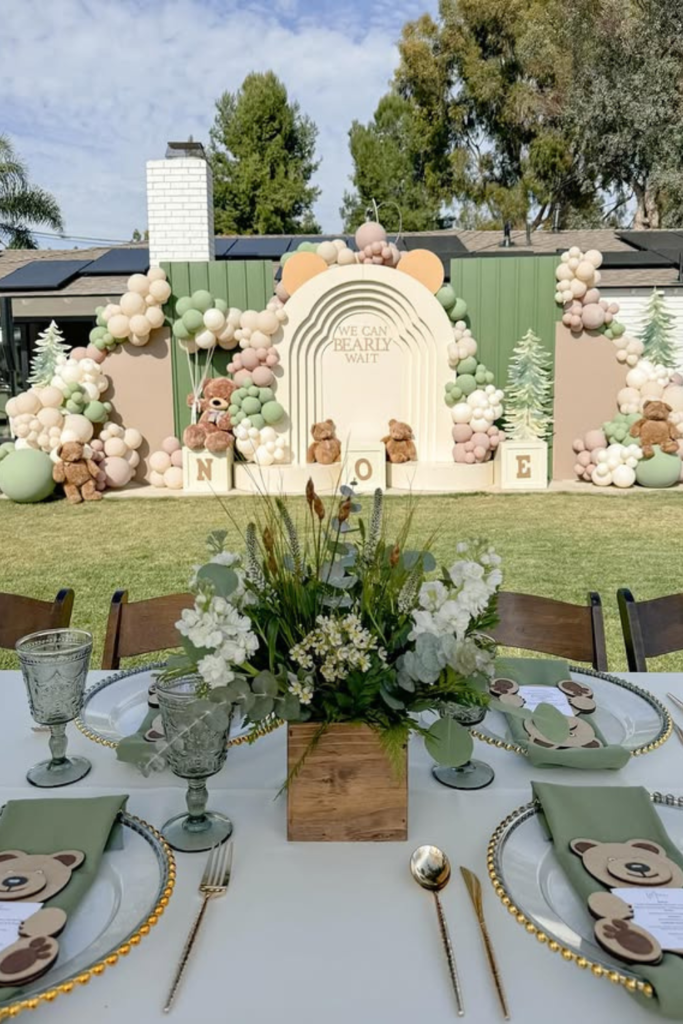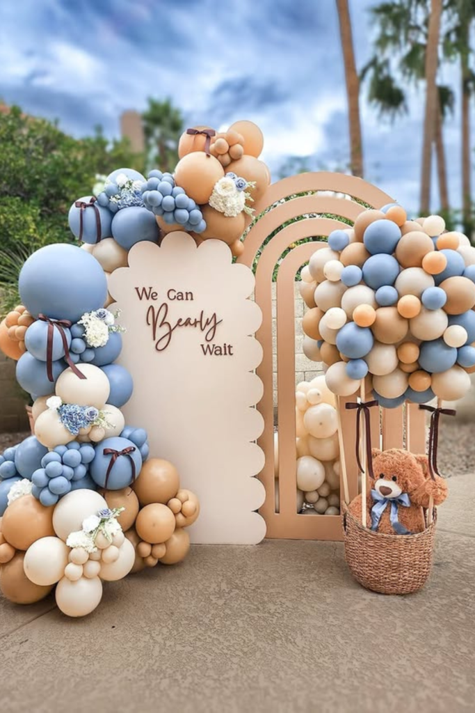 Balloon clusters replace heavy decor, and simple teddy details feel sweet rather than themed-out.