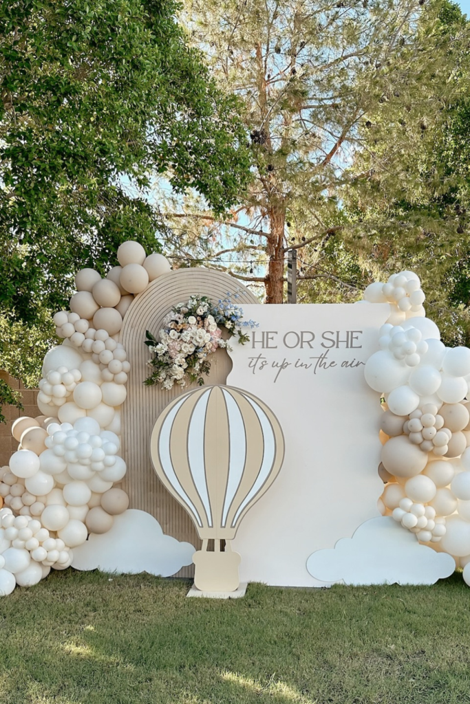 If you want a whimsical look without leaning pink or blue, hot-air balloon designs are an easy win.