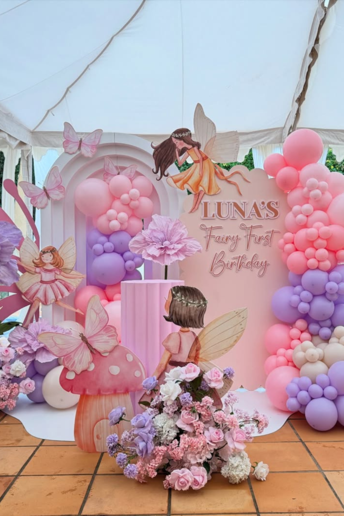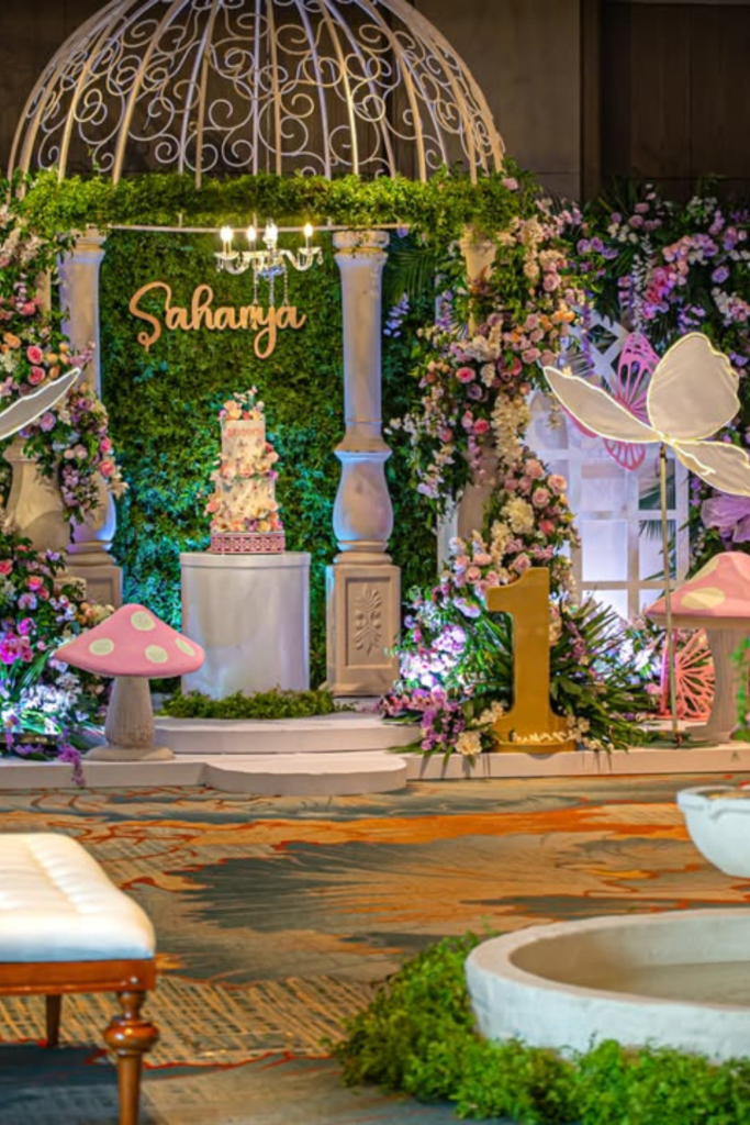 This enchanted garden style works because it commits fully: greenery walls, florals, soft lighting, and playful elements like oversized butterflies or mushrooms all live in the same visual world.
