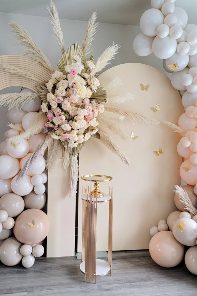 The trick is letting one statement backdrop do most of the work-arched panels, layered balloons in similar tones, and organic florals keep everything cohesive.