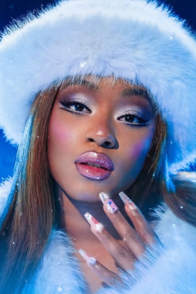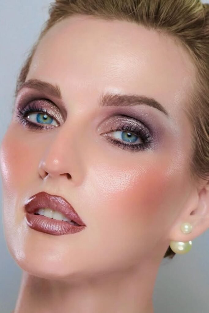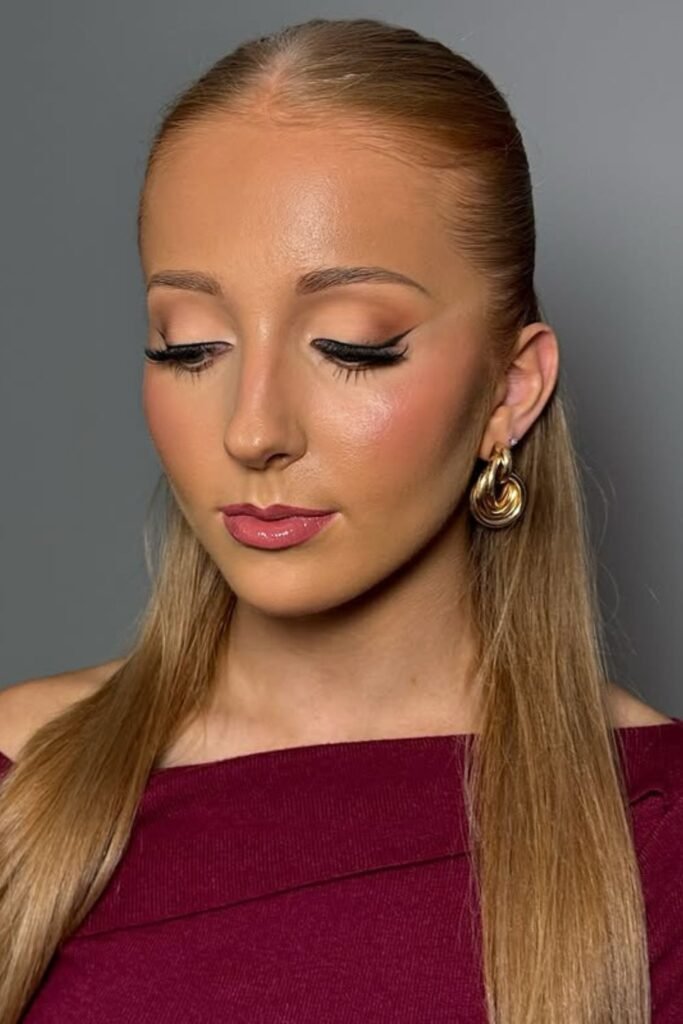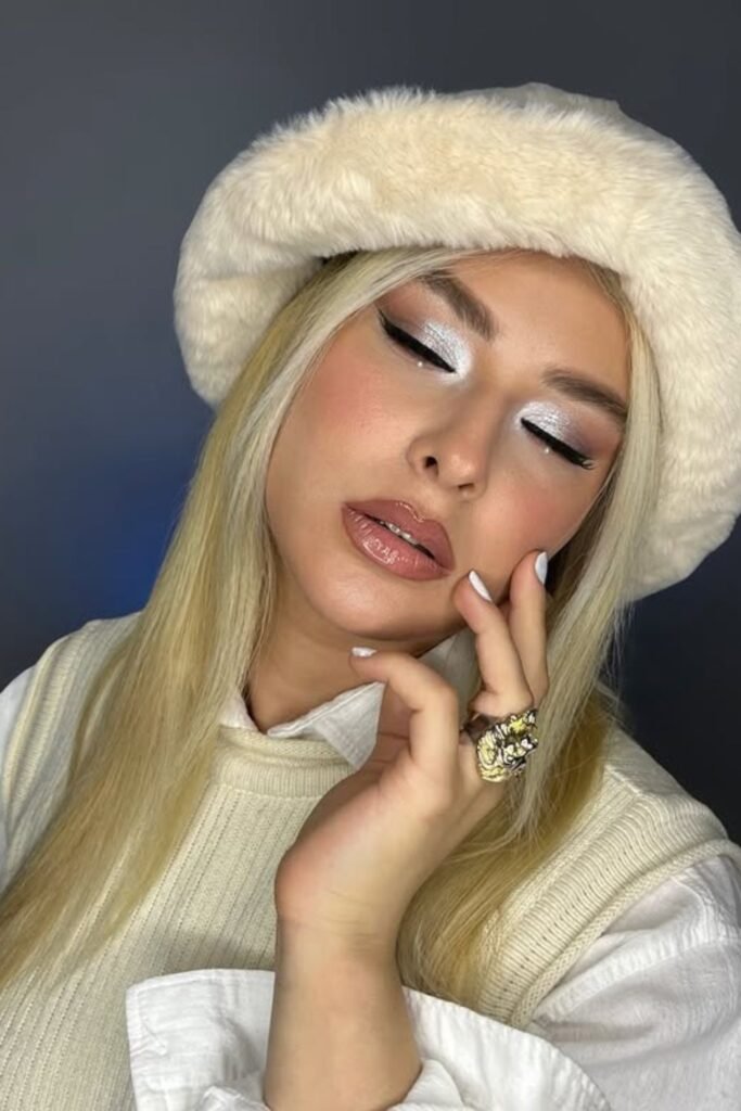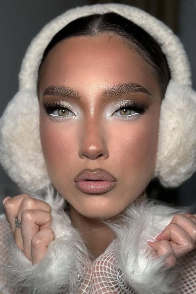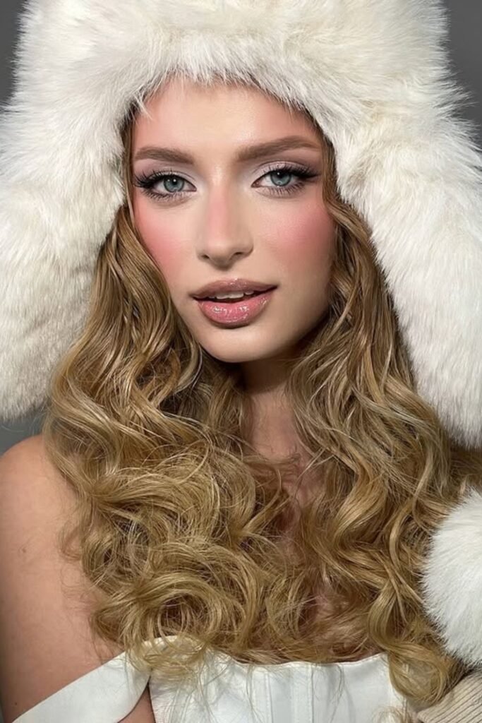 Winter lighting loves shimmer, and this look nails it with frosted pink lids, cool-toned blush, and a high-shine gloss that catches every glint of light.