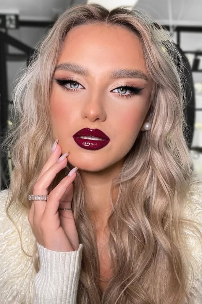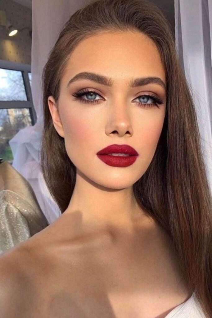Crimson tones always steal attention in winter light. This style has glossy, dark red lips and neutral eyes with little rhinestones on them. It looks both trendy and festive.