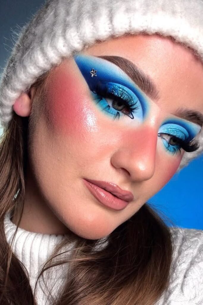 To get the look, mix cream and blue together, then add metallic powder and finish with small rhinestones to give your eyes that snowflake shimmer.
