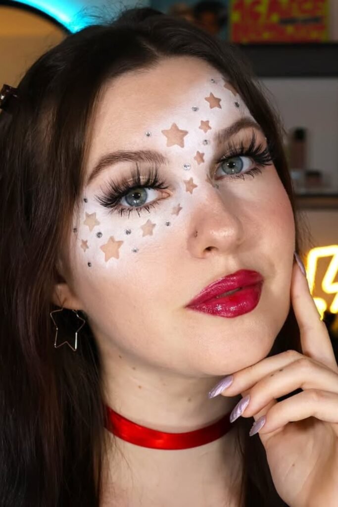 To make it look like stars, use white face paint to draw them, fill them in judiciously, and add tiny rhinestones for depth. This is makeup that feels happy and memorable.