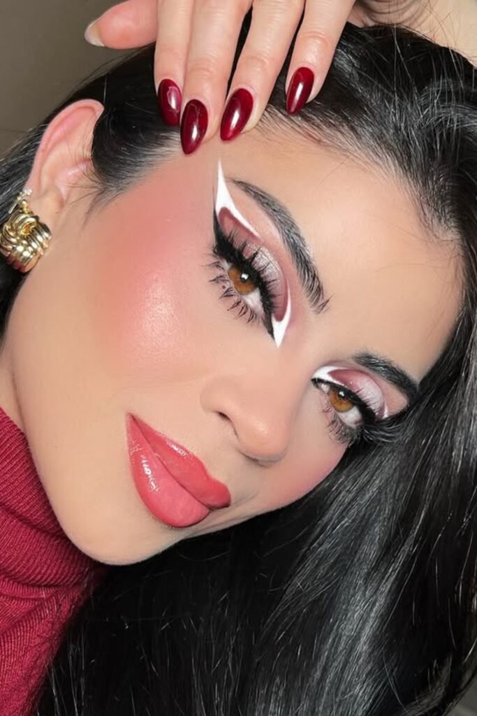Neutral tones don’t have to be boring. This makeup has mocha-brown shimmer on the lids, graphic white liner accents, and matte brown lips. It gives winter a modern twist.