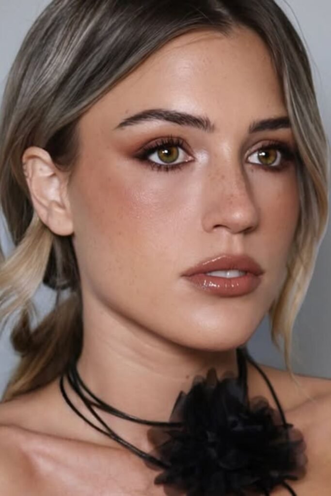 The golden shimmer highlights work perfectly with the bronze-brown smoky eyes, and the glossy nude lips keep everything looking sophisticated and balanced.