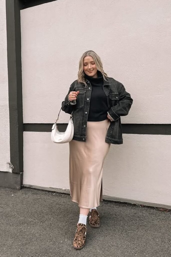 Cold sidewalks don’t always need heavy jeans to feel winter-ready.A black turtleneck and a satin midi skirt underneath make the look light, and an oversized denim jacket.