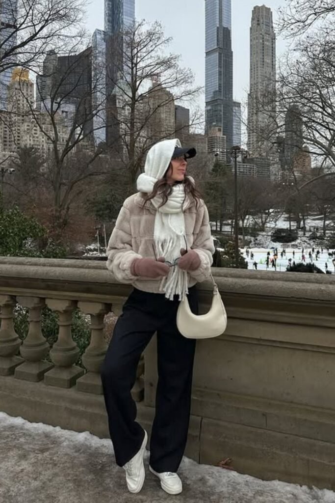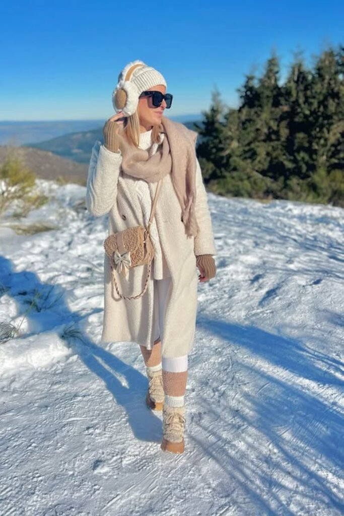 Bright snow exposes every weak winter layer, so this setup relies on soft cream tones that reflect light and still hold warmth.