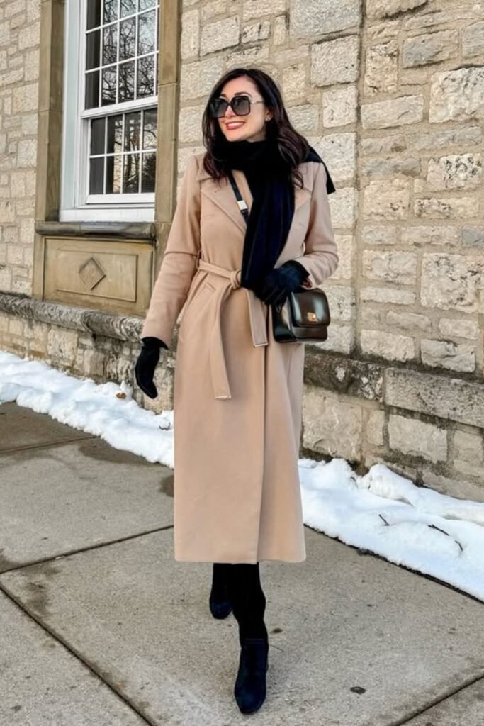 A belted beige wool coat keeps you warm and your shape tidy, while all-black layers underneath are easy to move around in for lengthy hikes.