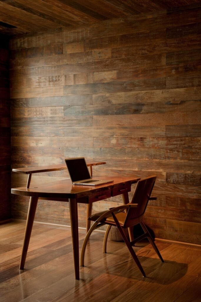 To recreate this look, choose a solid wood desk in walnut or a similar rich stain. Pair it with matching wood flooring or a wood-paneled wall.