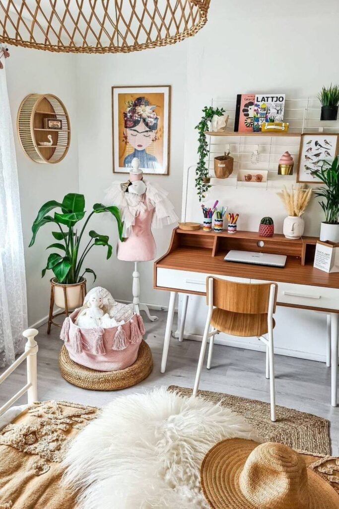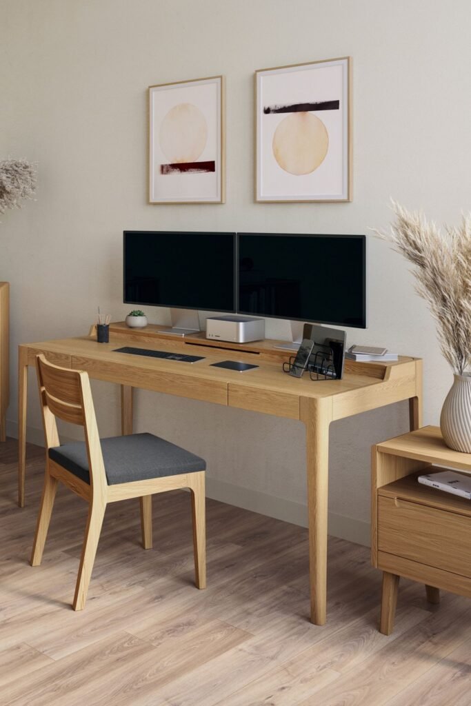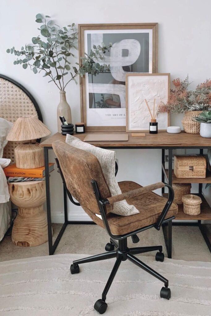 That combination makes the space feel layered but still airy. To recreate this look, choose a wooden desk with clean lines and a slightly warm finish.