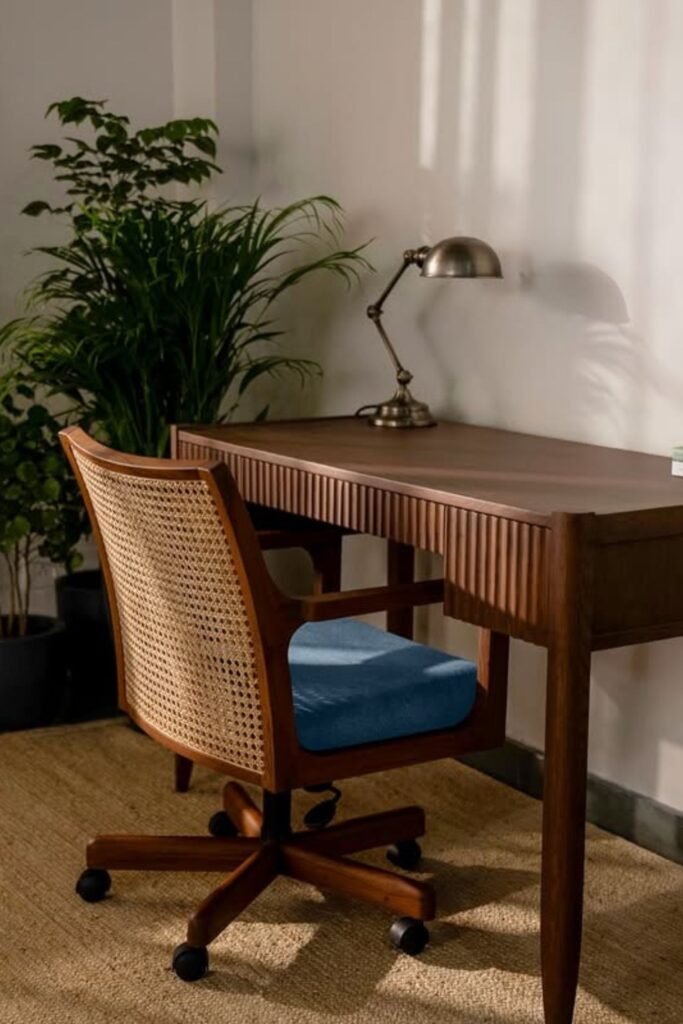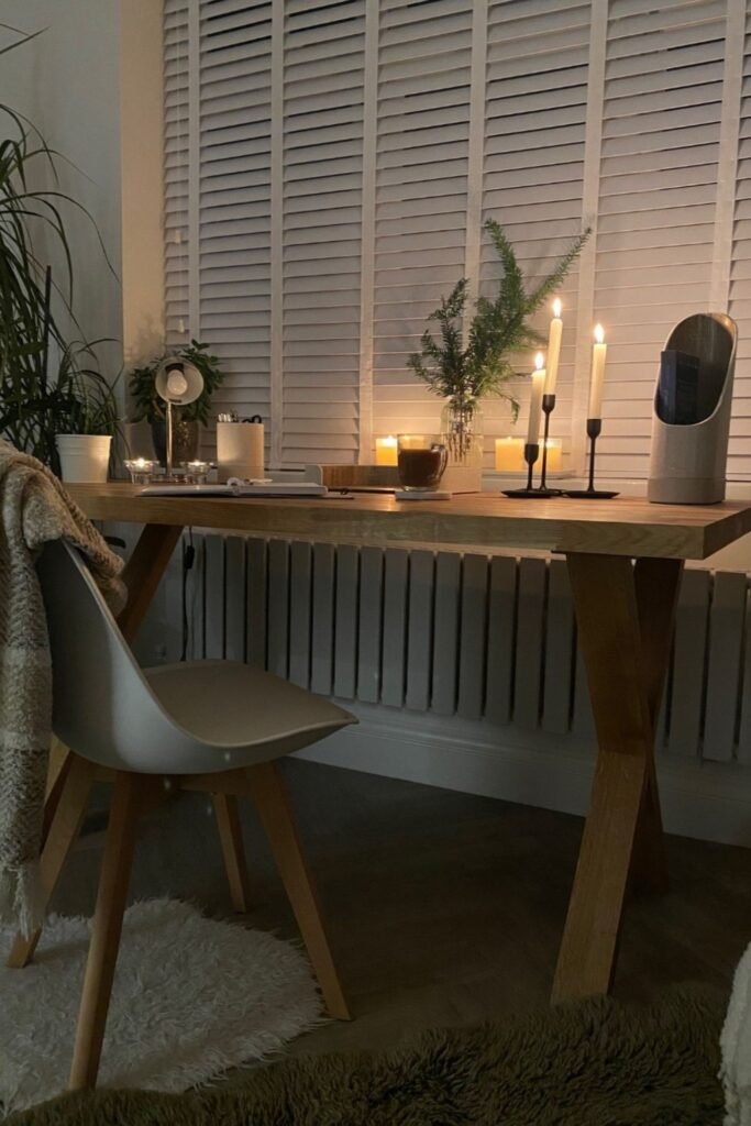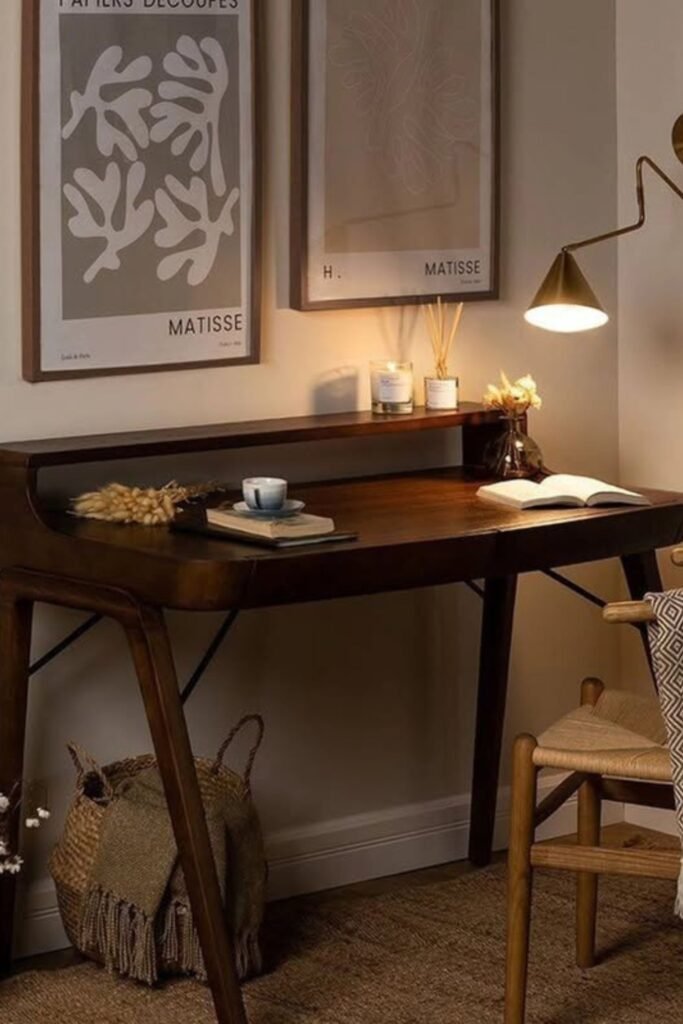 Work doesn’t always have to feel cold and bright. A simple wooden desk with thick legs instantly creates a grounded, calming setup especially in a bedroom or quiet corner of the house.