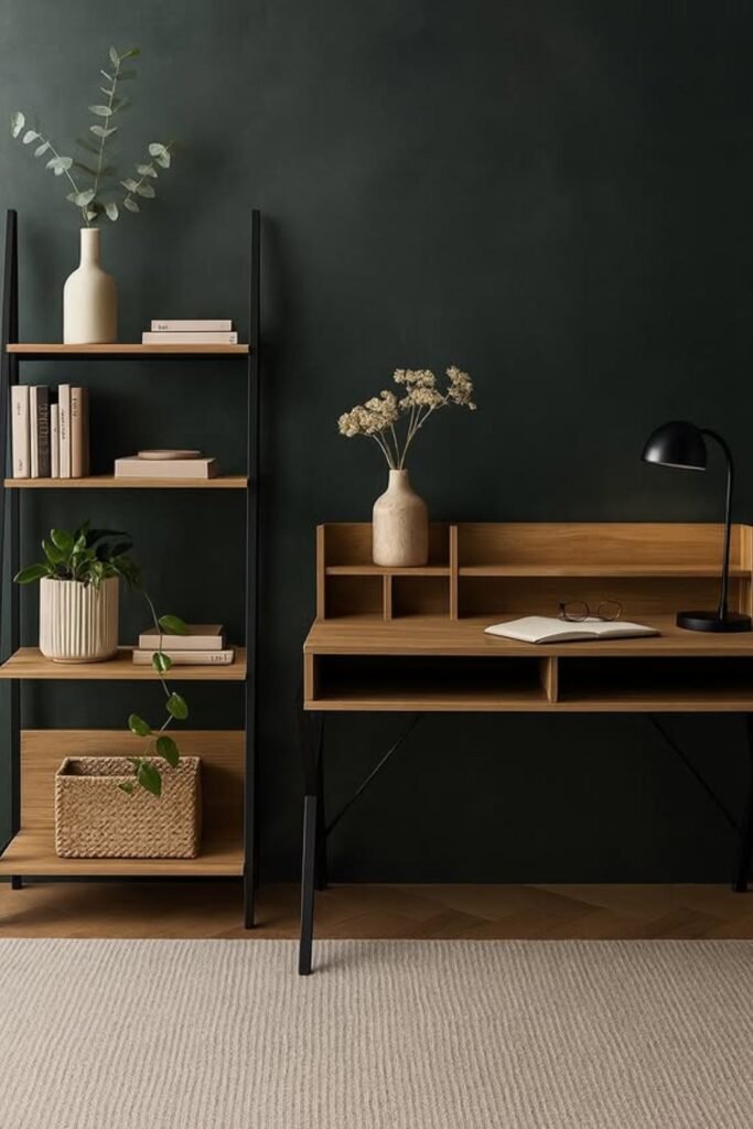 To recreate this setup, pair a walnut or oak desk with matte black legs or accents. Choose one bold wall color and keep everything else neutral.