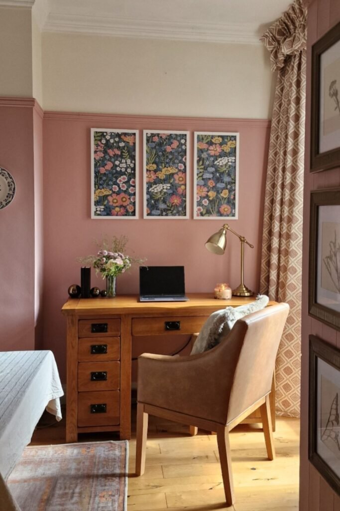 Soft pink walls and solid wood create a space that feels personal and warm. A traditional wooden desk with multiple drawers works beautifully in a bedroom office.