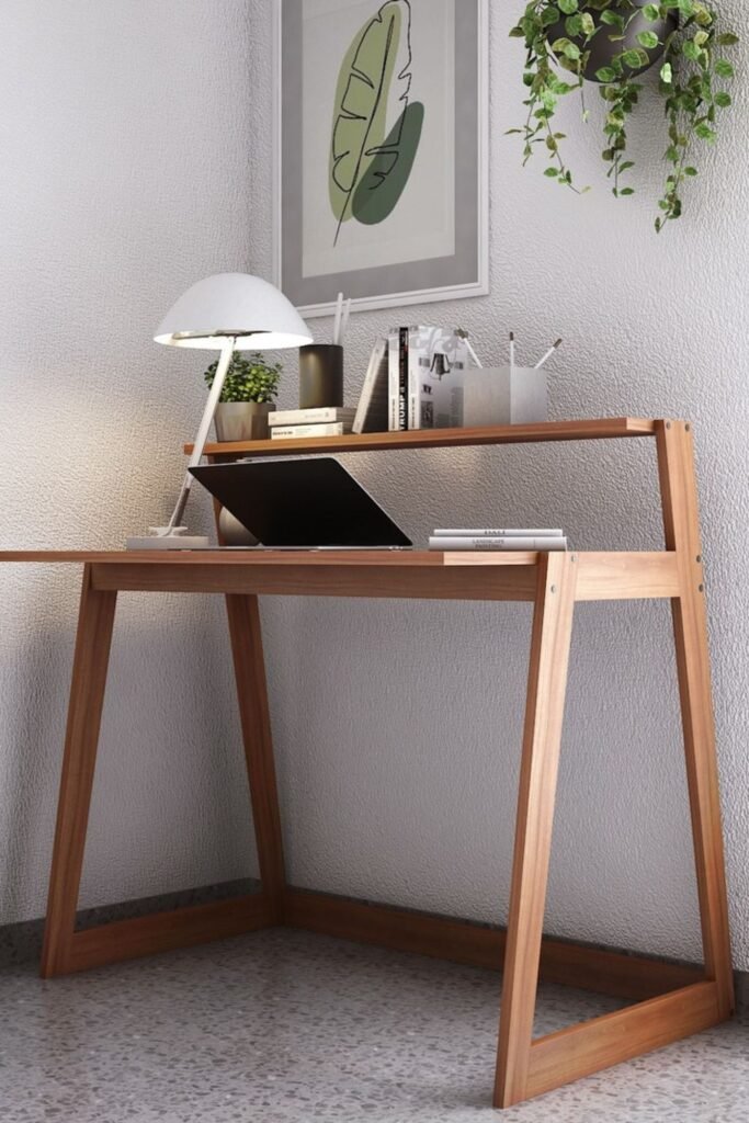Tight corners don’t need bulky furniture. A slim wooden desk with angled legs keeps the space open while still giving you a proper work surface.