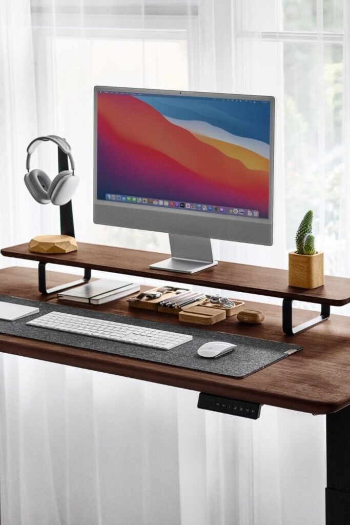 Recreate this setup with a height-adjustable base and a solid wood top in walnut or a deep oak finish. Add a slim monitor riser in matching wood for a layered look.