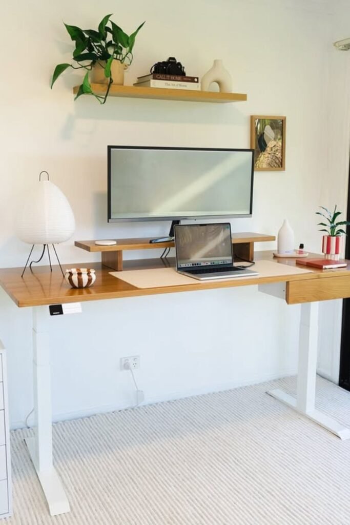 Long hours at a desk can drain your energy fast. A wooden standing desk with a rich top and black adjustable legs keeps the space modern while giving you flexibility.