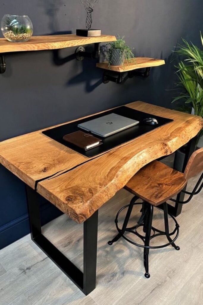 To recreate this setup, look for a thick live-edge top in oak or acacia. Pair it with sturdy black steel legs for contrast. Keep accessories minimal one laptop, one notebook, one plant.