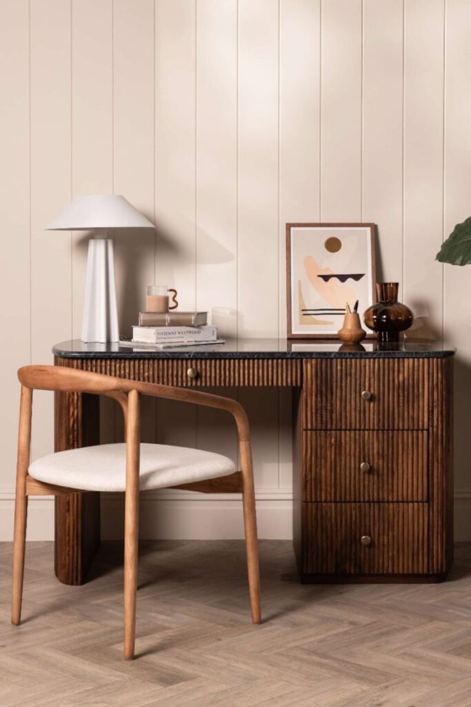 Recreate this style by choosing a fluted or ribbed wooden desk in a deep walnut tone. Keep the wall color neutral so the texture stands out.