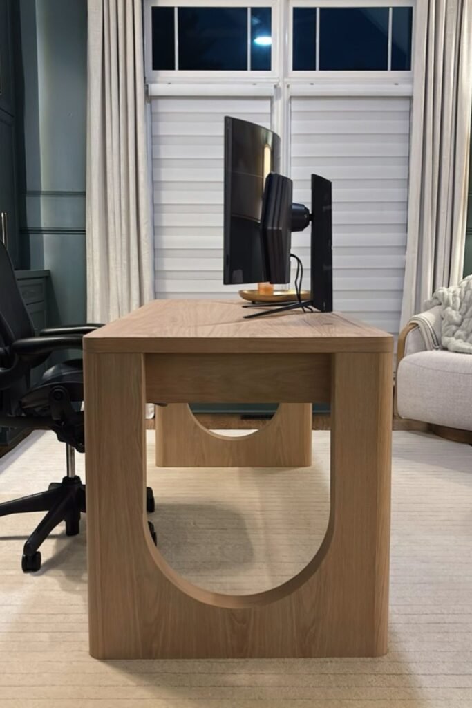 Strong shapes make a desk unforgettable. Thick wooden panels with a curved cut-out instantly turn a simple workspace into a design feature.