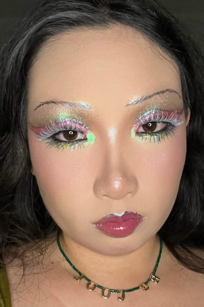 You can blend pink into green across your eyelids to create a rainbow effect. Next, add a shimmery highlighter to the inner corners of your eyes to make them pop.