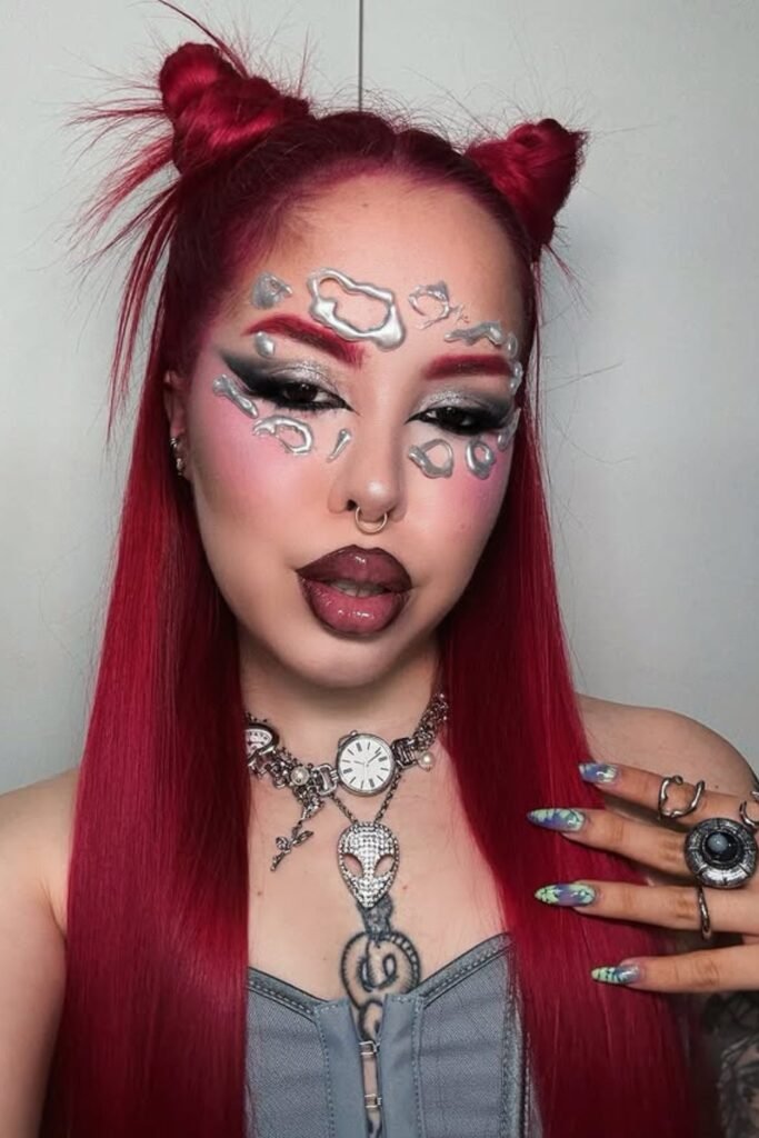 You can start by blending a silver shimmer across your eyelids. Then, add some raised metallic details around your eyebrows for a cool cyber look.