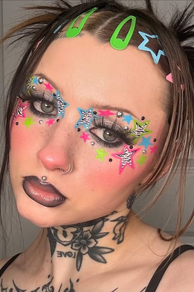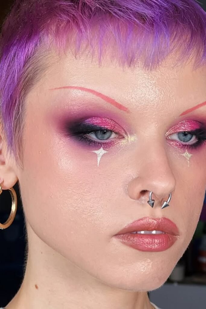You can blend a hot pink shimmer with a smoky black on the outer edge. Then, add some star-shaped details under your eyes for a fun twist.