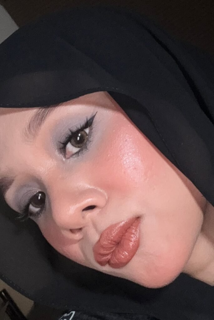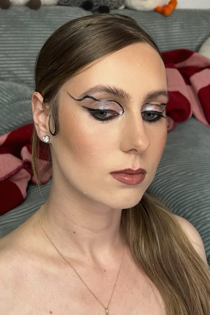 You can balance the strong eyes with glossy brown lips and a soft contour, which will keep the focus on the graphic shape you created.
