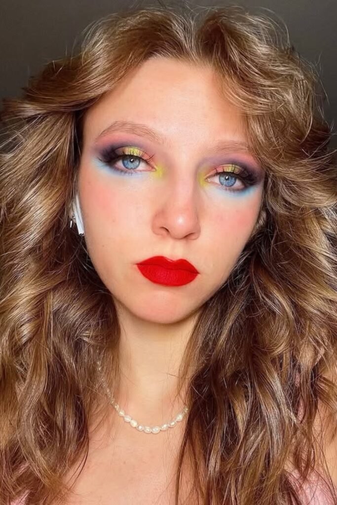 Finish the look with matte red lips to contrast the colorful eyes and give it a retro-glam vibe.