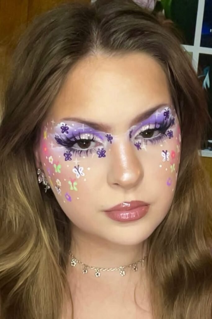 Sweep lilac eyeshadow across your eyelids and paint floral designs by hand around your eyes and cheeks.
