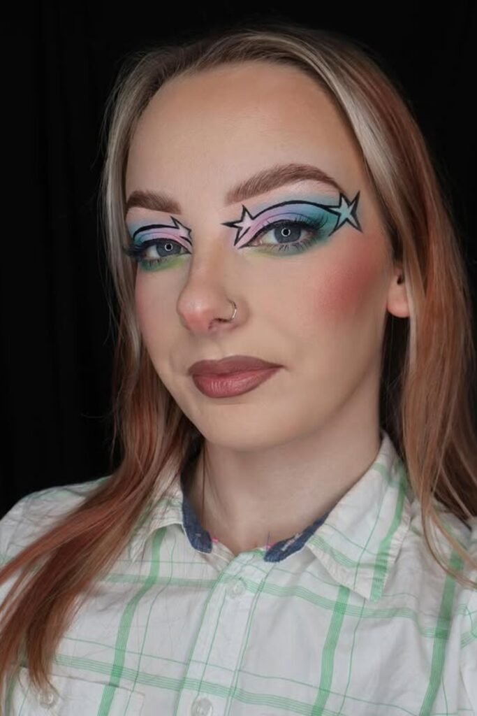 Apply pastel blues and greens to your eyelids, then draw bold black stars at the outer corners for a cool, graphic look.