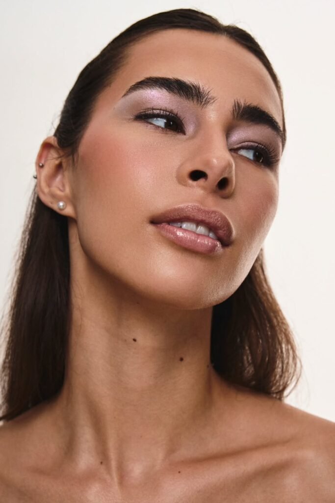 To get the look, sweep a light lavender shimmer over your eyelids and finish with glossy, nude lips.