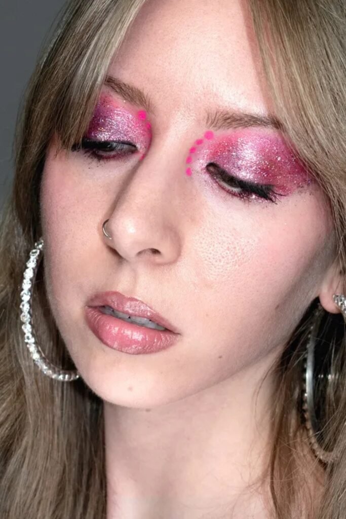 First, sweep a bold pink glitter shadow over your eyelids. Next, add small dots around your eyebrows for a fun, retro feel.
